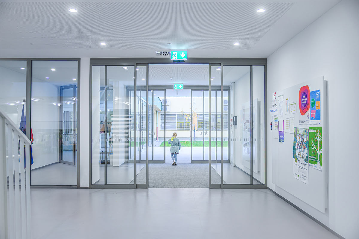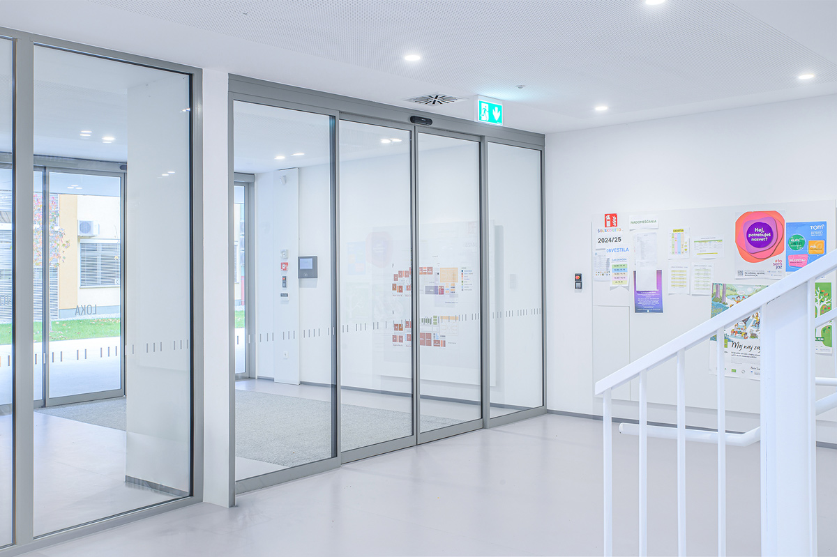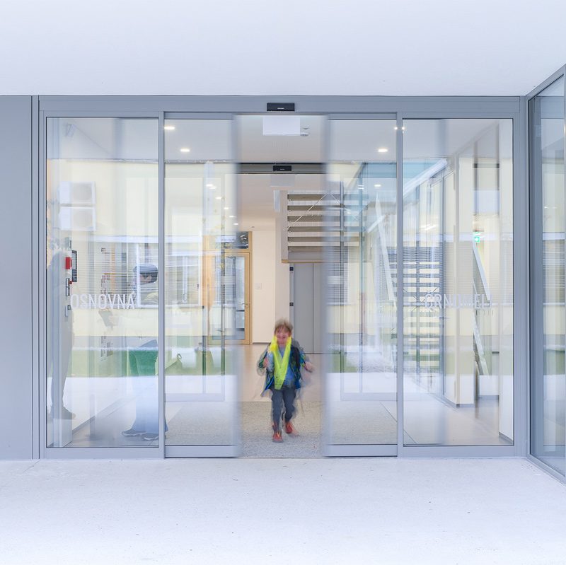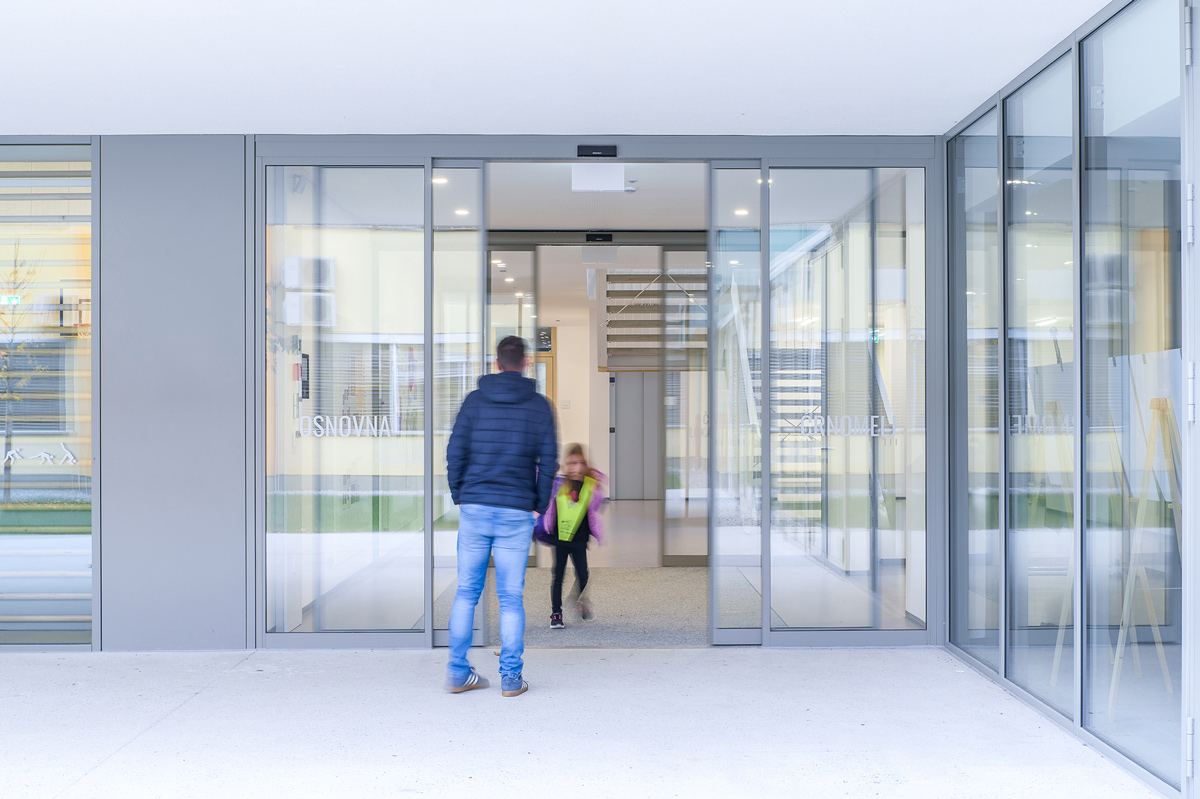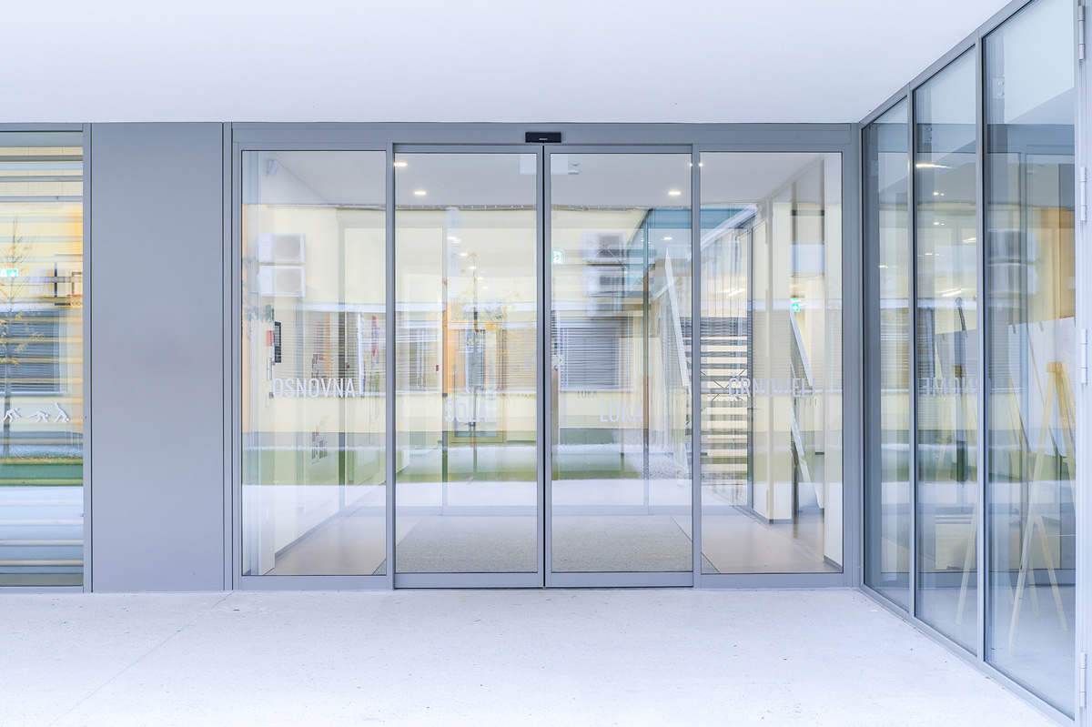 Staklena fasada zajedno s automatskim kliznim vratima 300 na glavnom ulazu pruža pogled na obližnji park i propušta obilje prirodnog svjetla u unutrašnjost. To poboljšava dobrobit i koncentraciju djece, doprinosi kvalitetnijem učenju te stvara ugodno i poticajno okruženje za učenike i nastavnike.