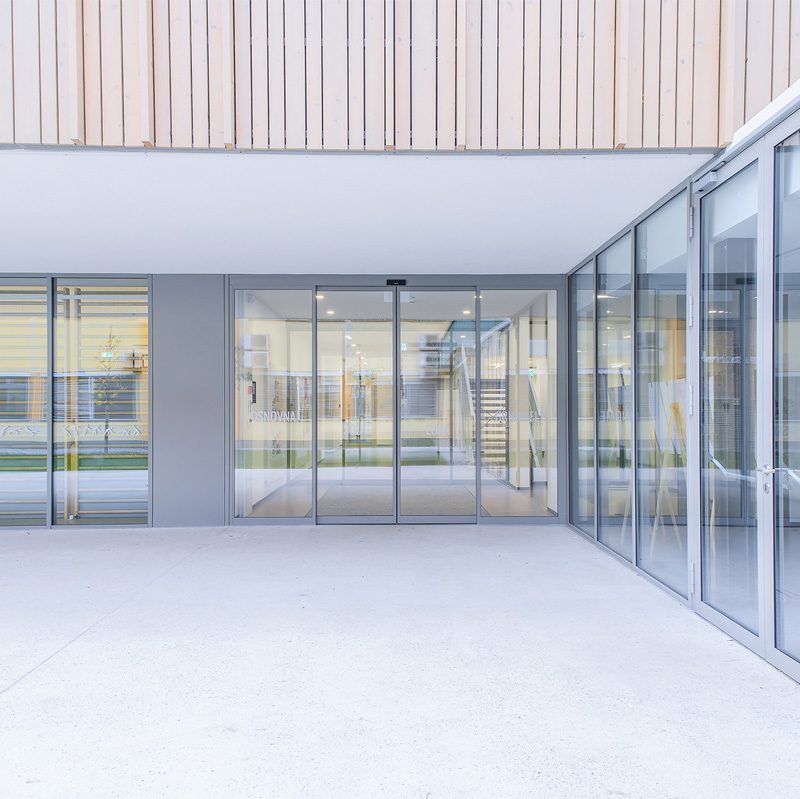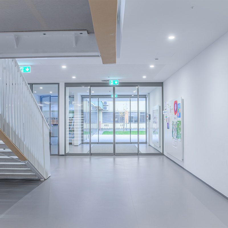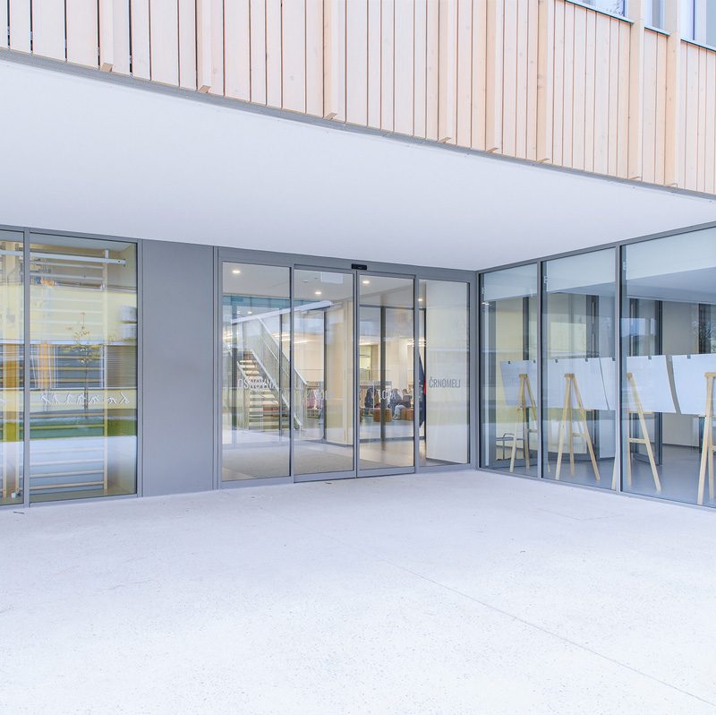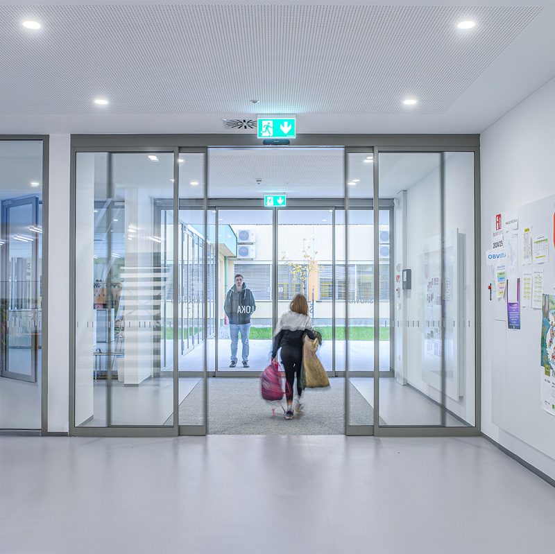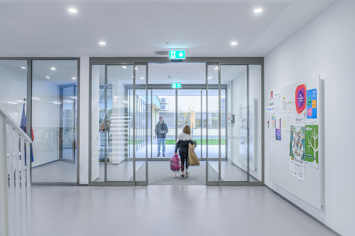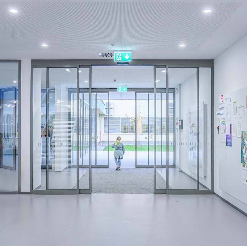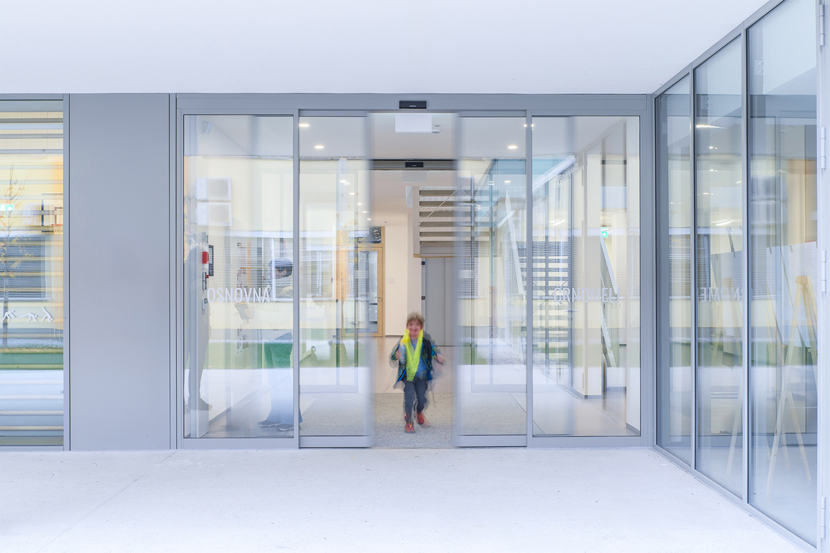 Staklena fasada zajedno s automatskim kliznim vratima 300 na glavnom ulazu pruža pogled na obližnji park i propušta obilje prirodnog svjetla u unutrašnjost. To poboljšava dobrobit i koncentraciju djece, doprinosi kvalitetnijem učenju te stvara ugodno i poticajno okruženje za učenike i nastavnike.
