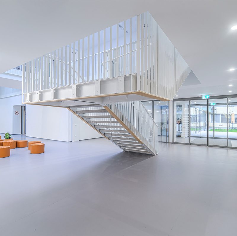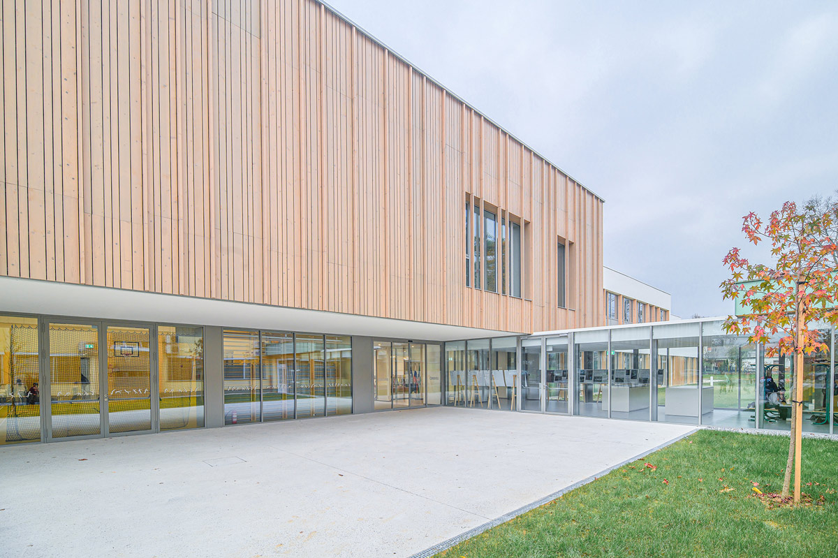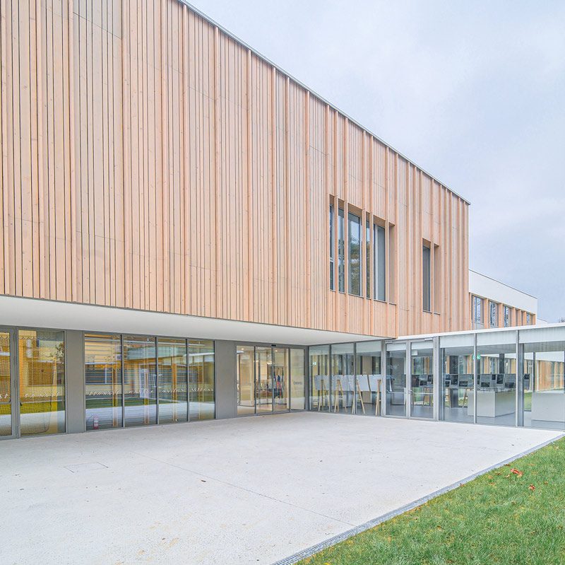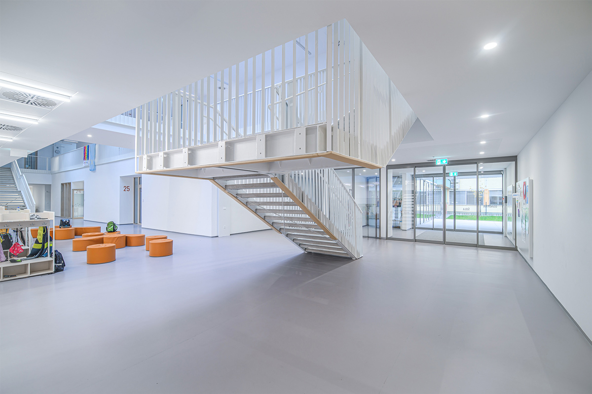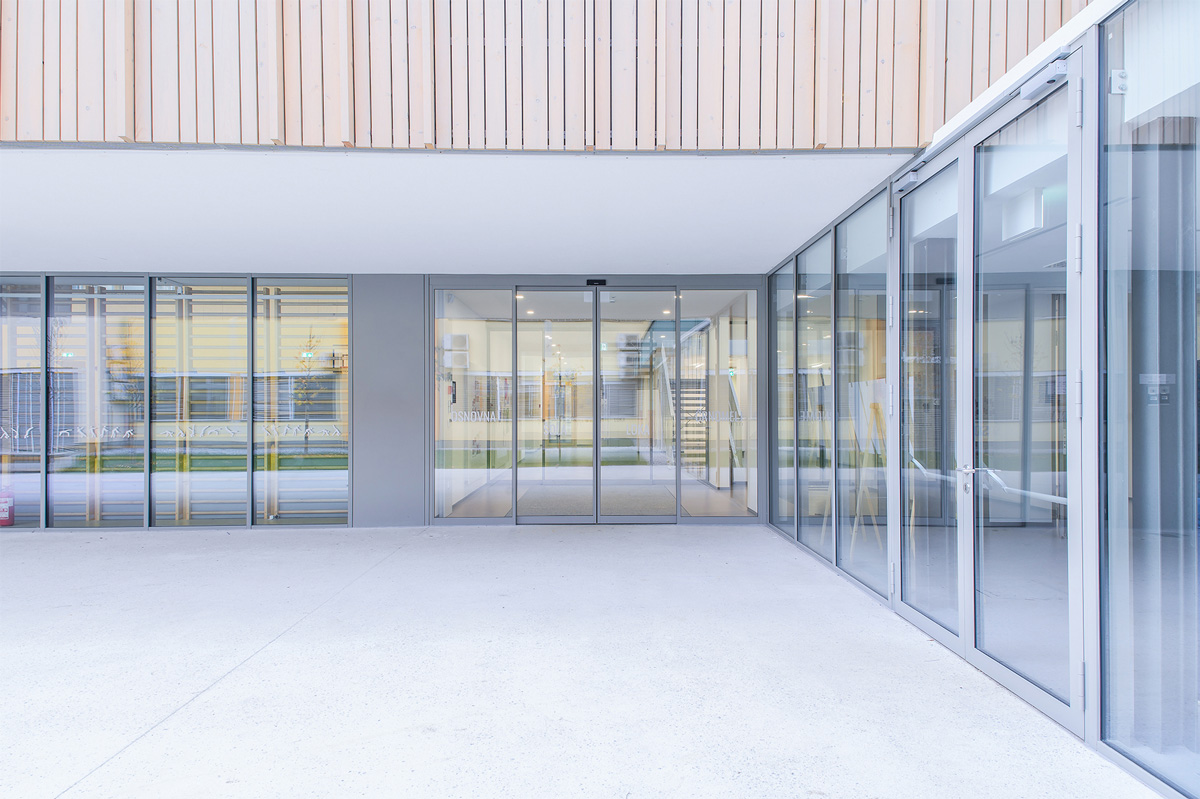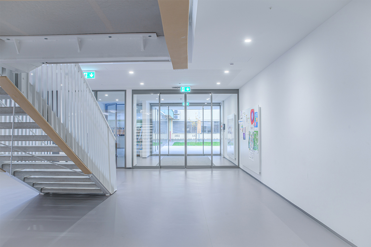 Staklena fasada zajedno s automatskim kliznim vratima 300 na glavnom ulazu pruža pogled na obližnji park i propušta obilje prirodnog svjetla u unutrašnjost. To poboljšava dobrobit i koncentraciju djece, doprinosi kvalitetnijem učenju te stvara ugodno i poticajno okruženje za učenike i nastavnike.